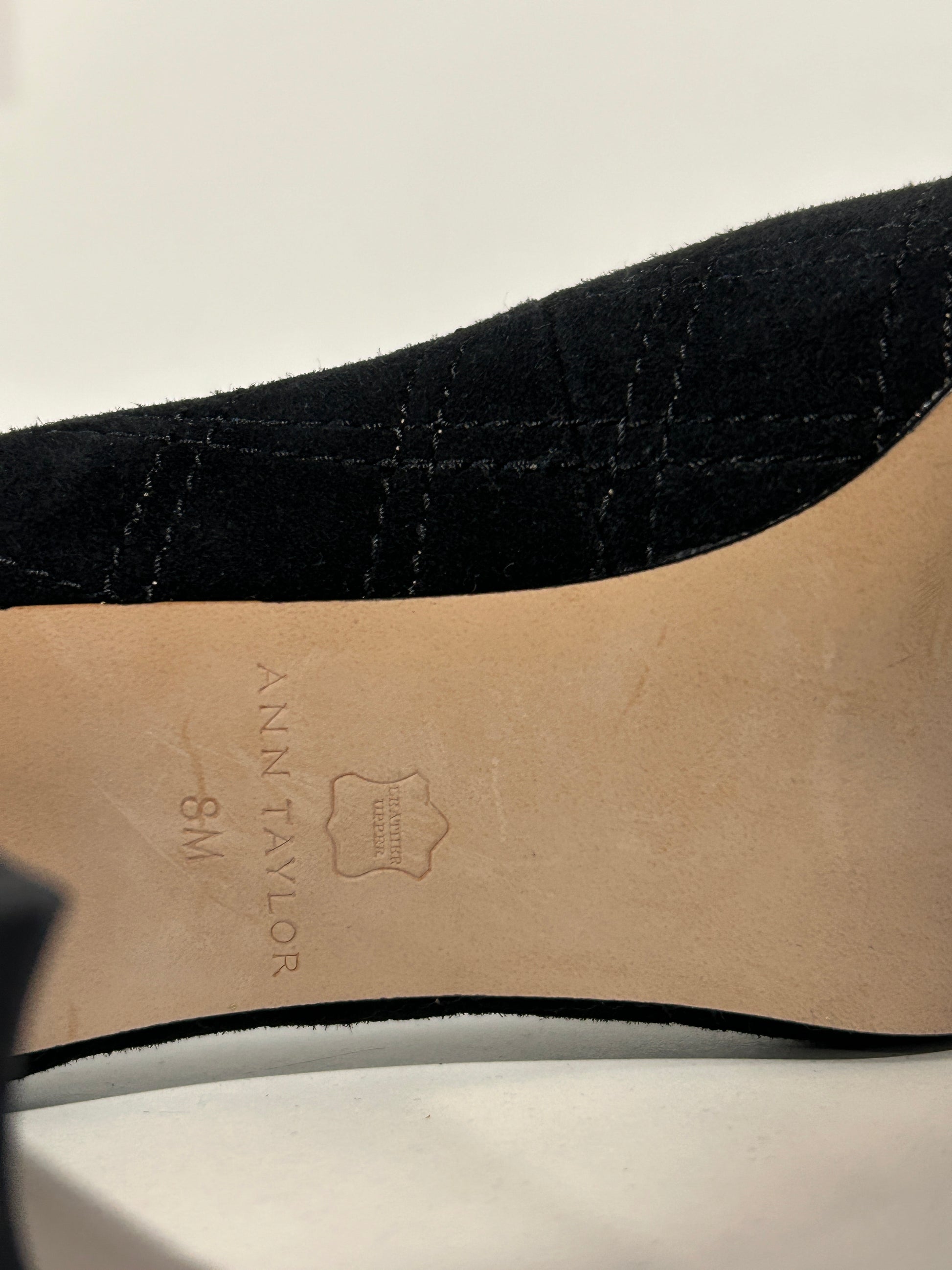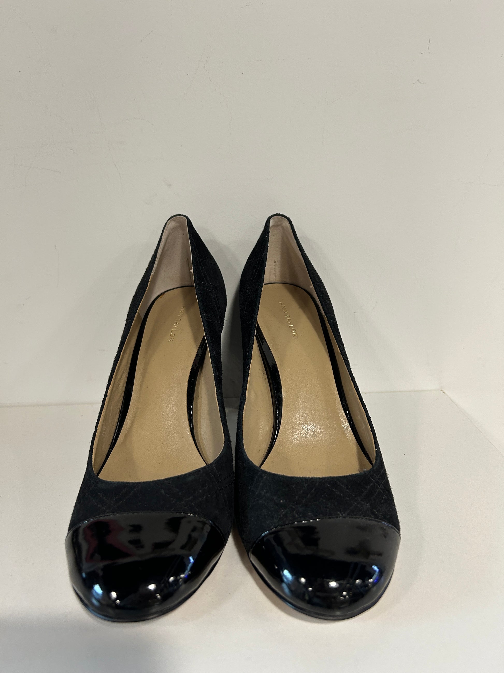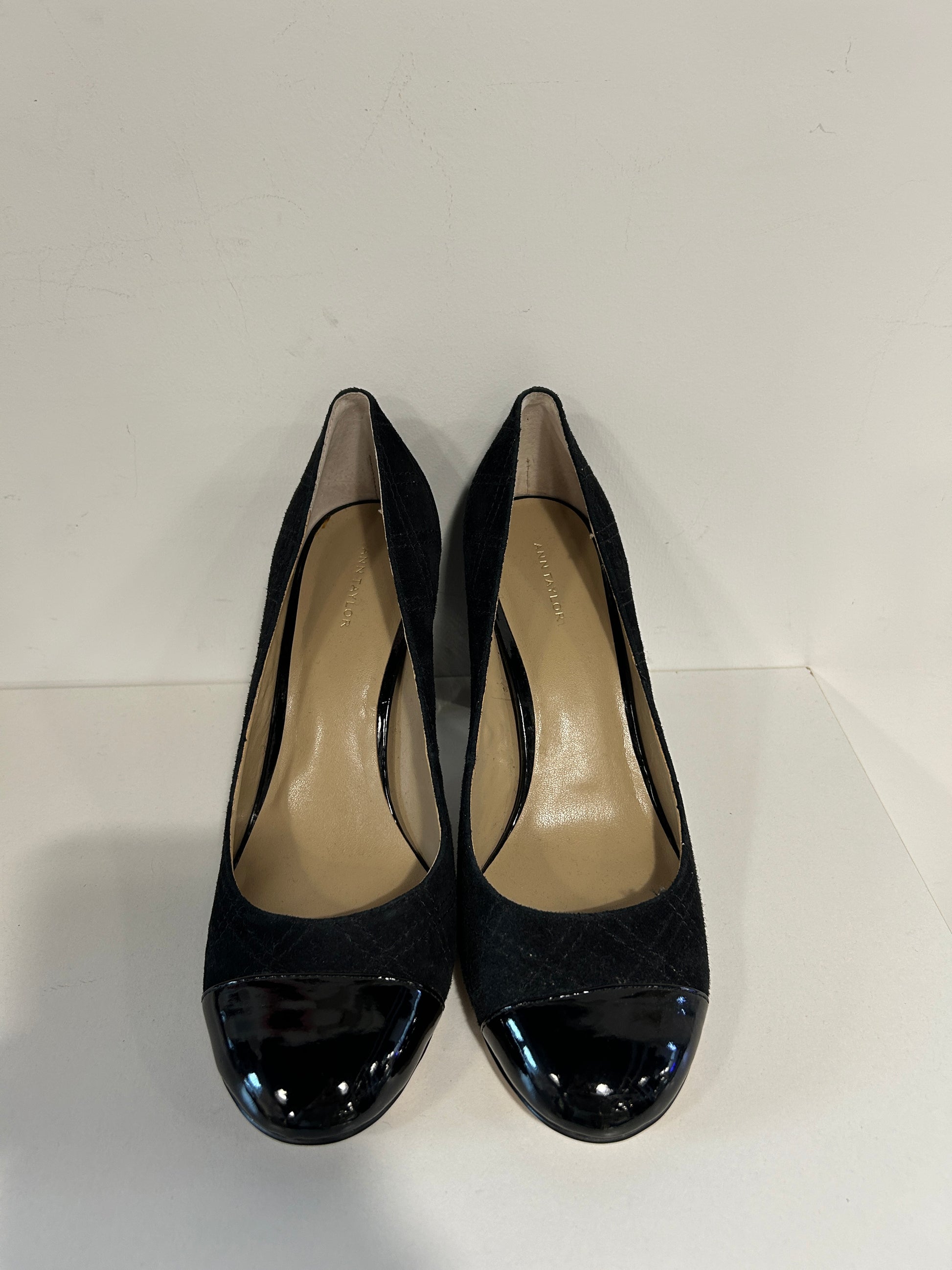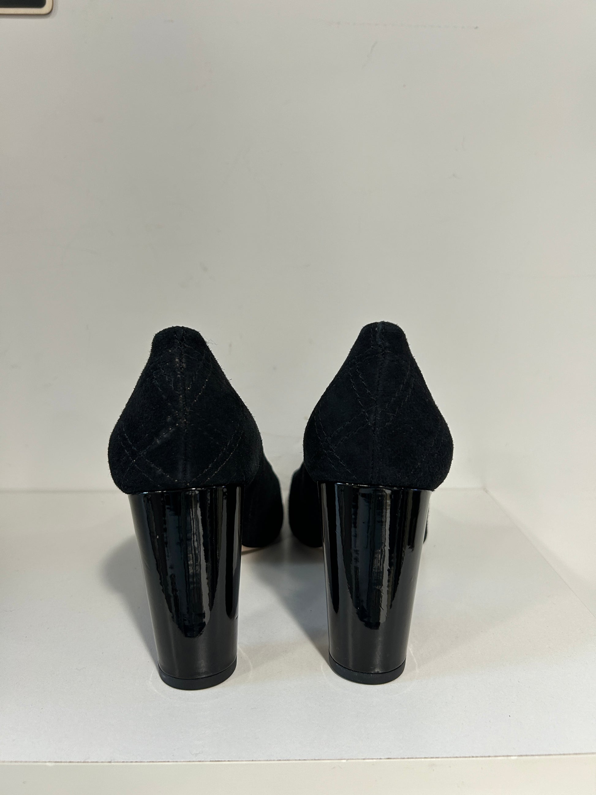 Ann Taylor black quilted suede block heels with a patent leather cap rounded toe