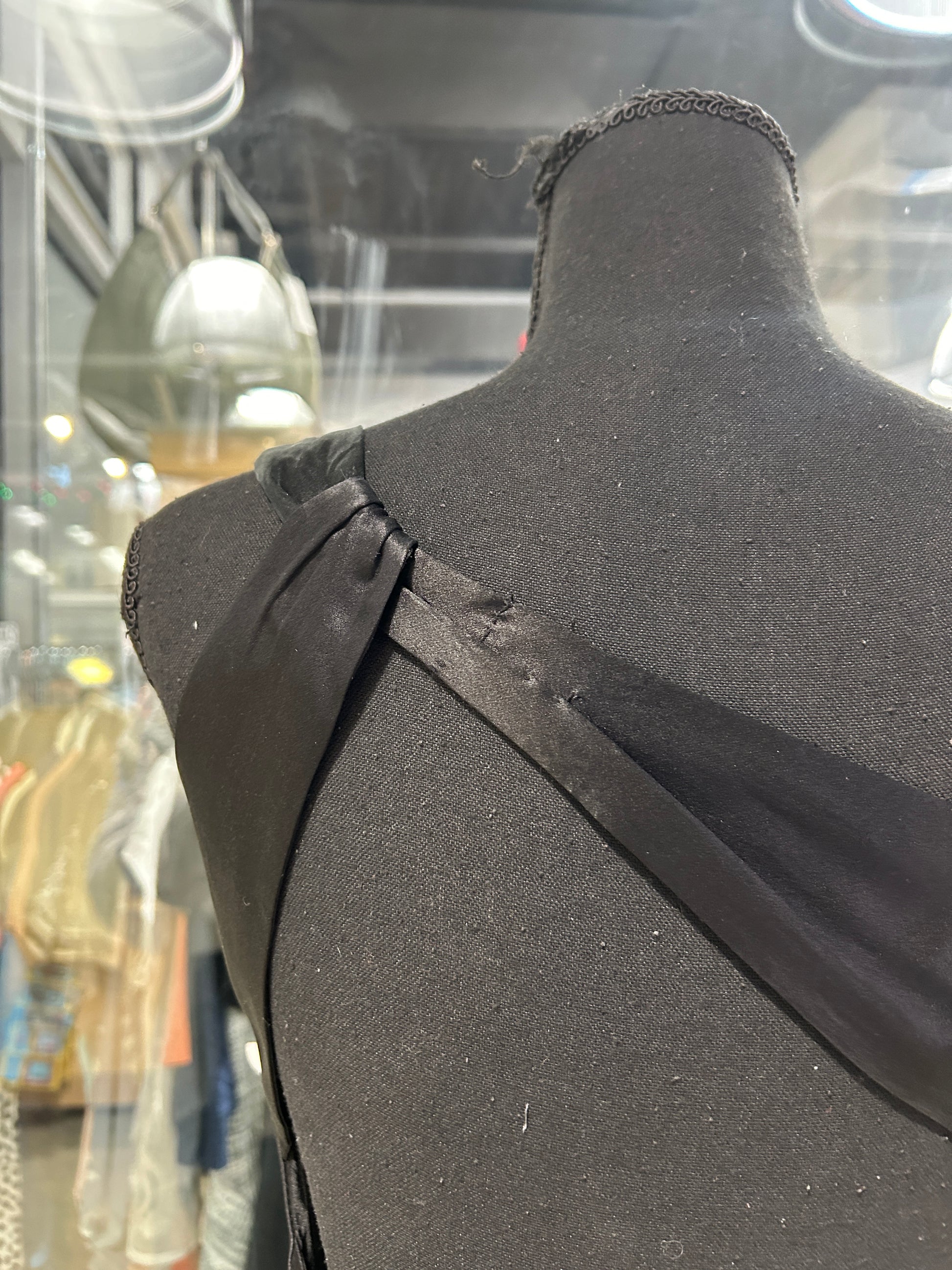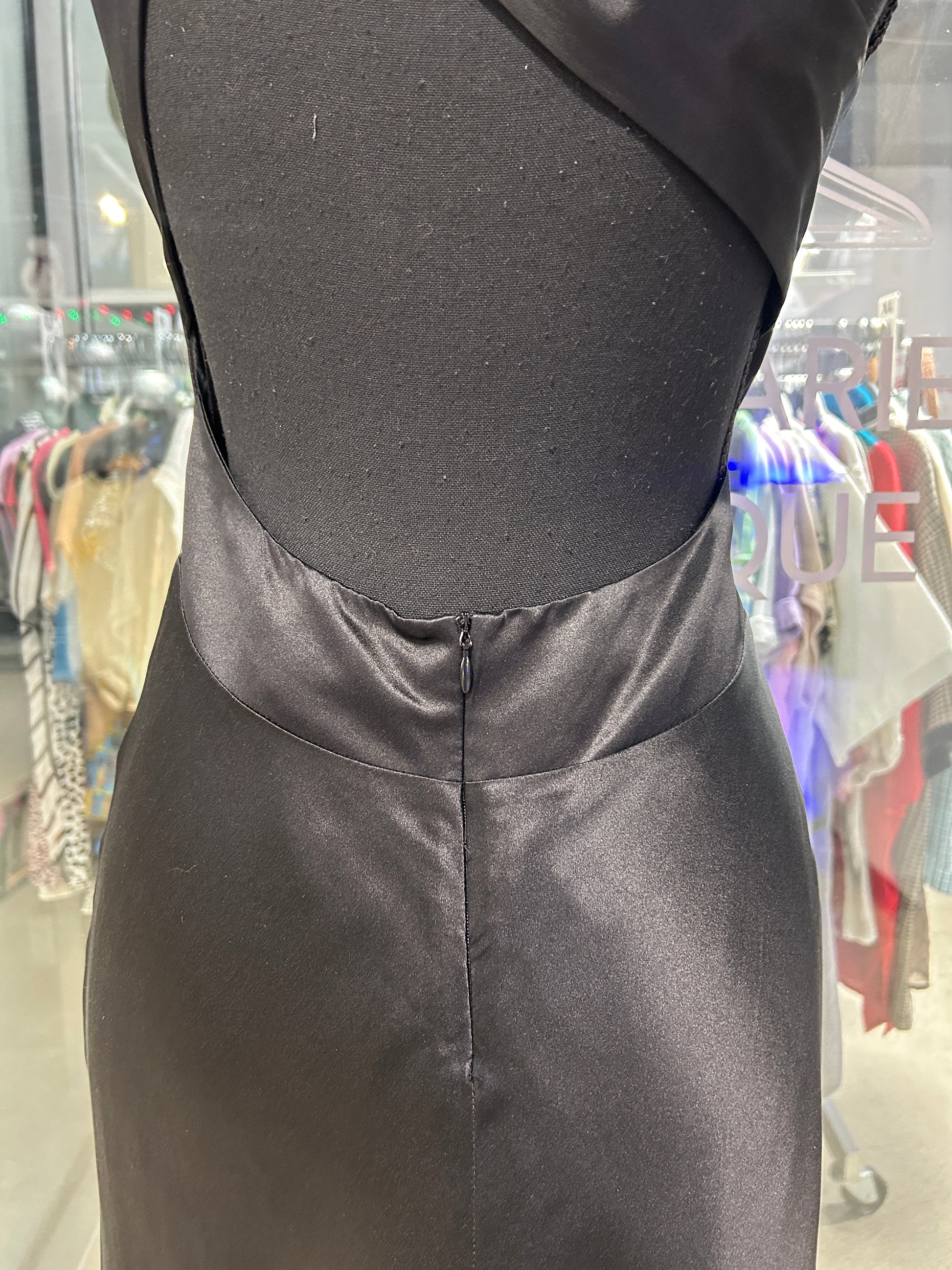 black satin one-shoulder midi dress with a semi-open back