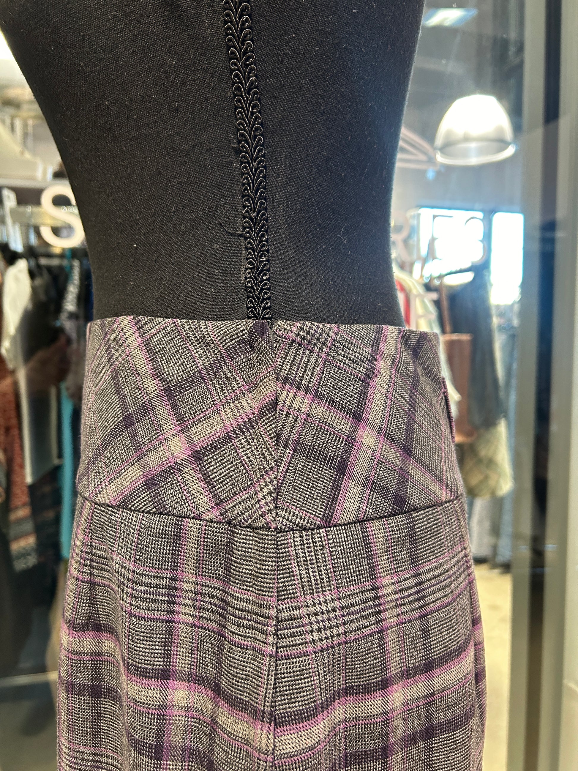 grey and purple plaid midi skirt with a zipper closure