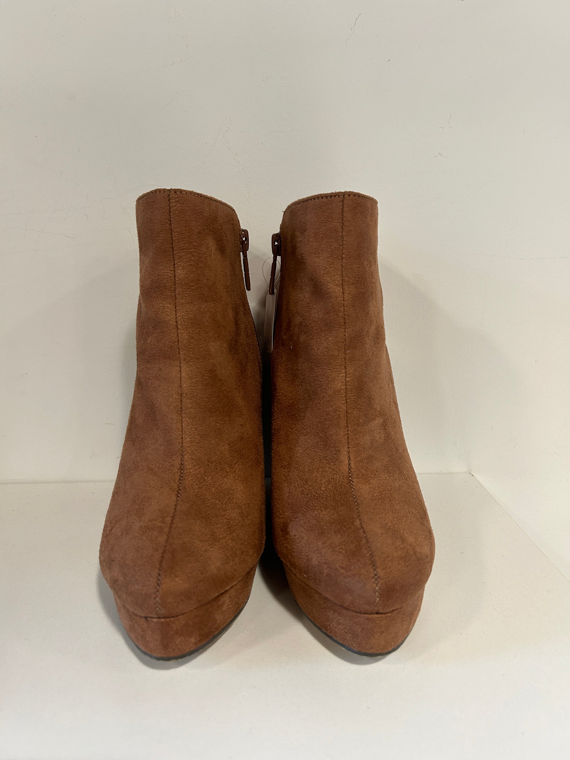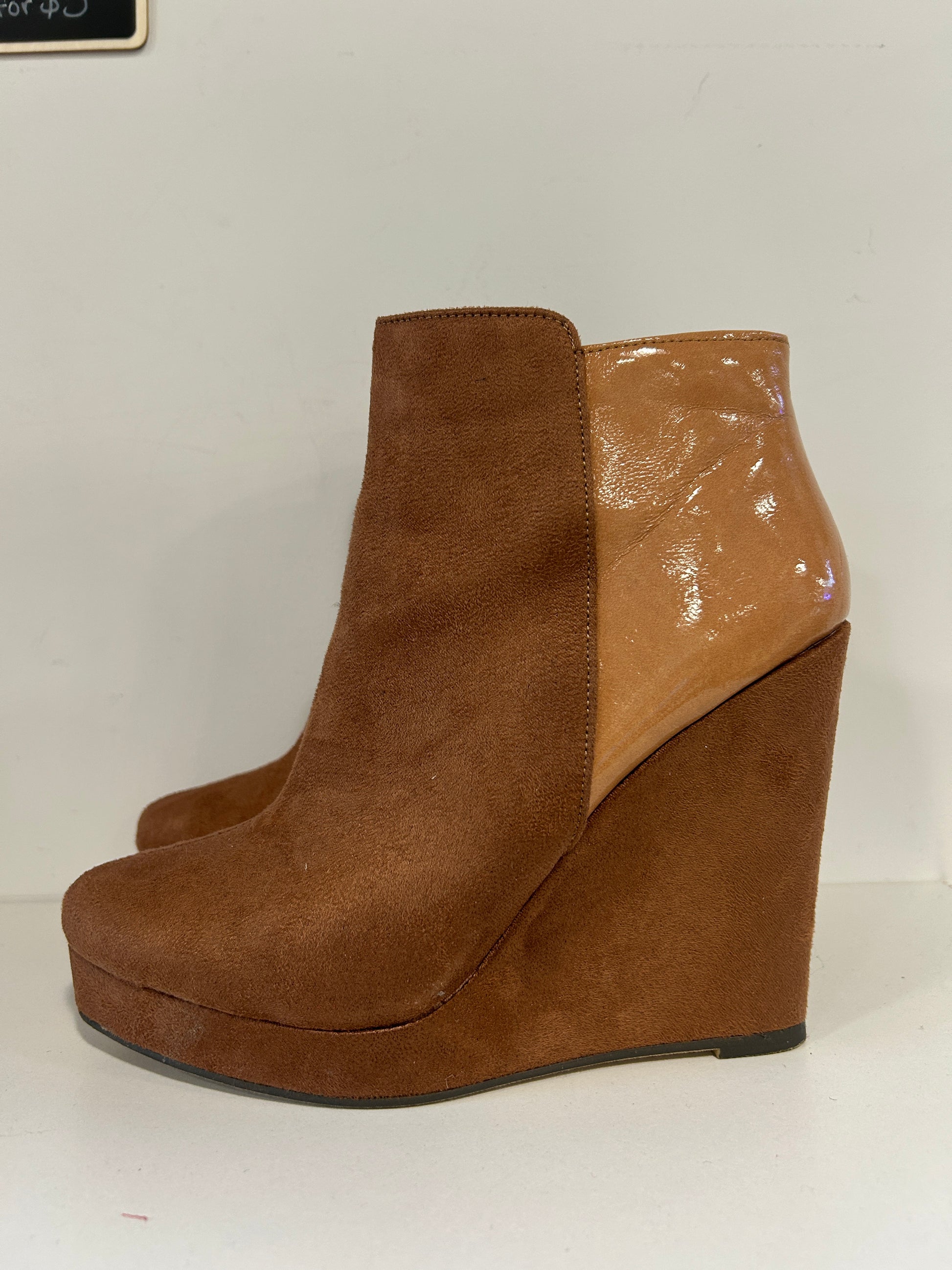 “Michael Antonio” wedge ankle boots with a faux suede and patent trim design. Wedge heel, almond toe, and side-zipper closure.