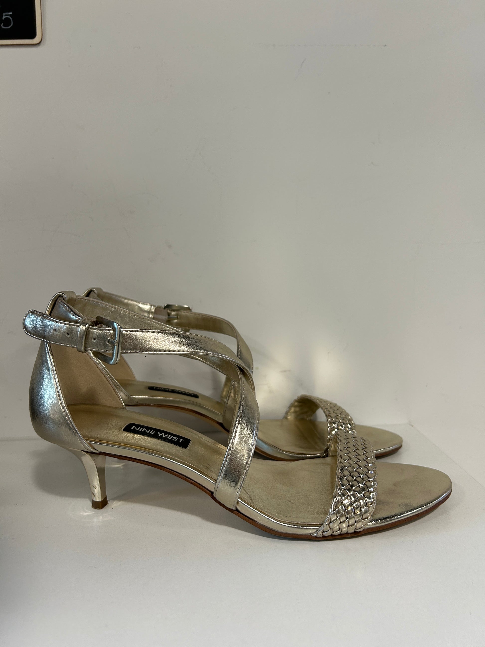 “Nine West” Gold Metallic Kitten-Heel Sandals With A Woven Toe Strap And Ankle Strap Buckle Closure